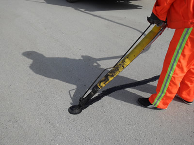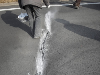 剛灌完的密封膠在其表面撒上干燥細沙,等密封膠充分冷卻,清掃完路面碎渣后,才能開放交通,一般冶卻時間為15分鐘左右,具體時間根據(jù)當時氣溫靈活掌握。